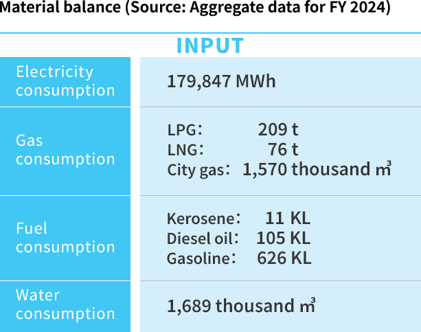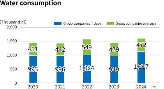 Regarding water, the total water intake decreased by 8% compared to the previous year. The target for reducing unit water consumption* to below the 2020 level (0.77) was also achieved, with a result of 0.55. Going forward, we will continue to manage and work towards reducing our environmental impact related to water.