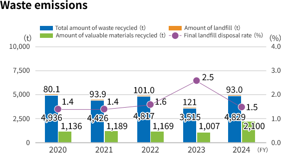 Waste overall emissions have decreased. A significant reduction was observed in waste oil and waste acid, with the reduction in the use of cutting oil due to the renewal of processing equipment in China being a contributing factor for waste oil. There have been no significant changes in other types of waste, and the proportion of waste directed to final disposal relative to total emissions has increased, resulting in a 0.9% increase in the final disposal rate.