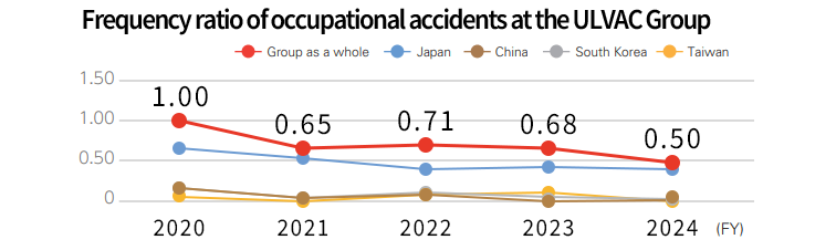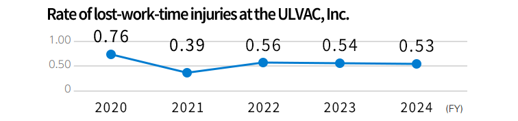 In the execution of development, manufacturing, transport, installation, maintenance and other business processes, everyone in the ULVAC Group, from senior management to line workers, is encouraged to seize the initiative in continuously undertaking improvements placing the highest priority on safety, striving to maintain and improve the safety of everyone involved and ensure a healthy working environment. Under the "ULVAC Basic Policy on Occupational Safety and Health Management System (OSHMS)," all executives and employees work together to promote continuous improvement activities to provide a safe and comfortable work environment. Each ULVAC Group company also complies with the safety and health laws and regulations of each country and region, aiming for "zero occupational accidents" and working to reduce risks.
