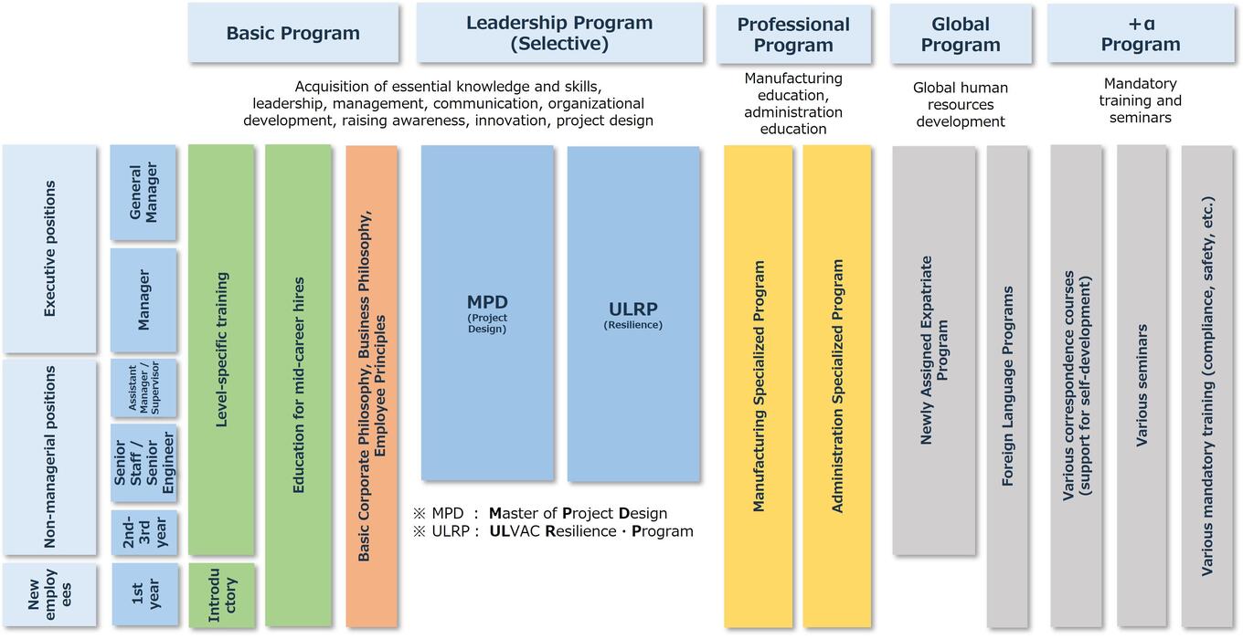 To achieve sustained growth, the ULVAC Group is committed to building dynamic organizations that empower diverse talent to reach their full potential. We are strengthening our efforts in organizational and talent development, supporting each employee in taking ownership of their career. By identifying and nurturing future leaders, we aim to reinforce our management foundation.