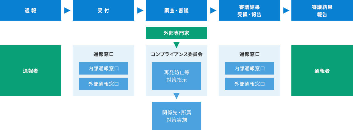 コンプライアンス委員会による調査結果をもとに、諸法令や諸規則の違反事実が認められると判断された場合、必要に応じて弁護士等の外部専門家の意見も取得した上で、違反事実について、即時停止や改善対応を実施し、違反行為に関与した者に対する処分を然るべき機関の審議を経て実施します。更に、違反行為が起きた根源的な原因まで検討を行い、より実効的な再発防止策を講じるよう努めています。